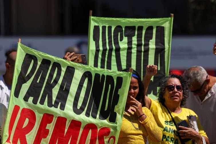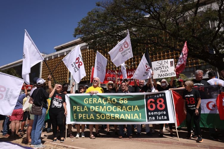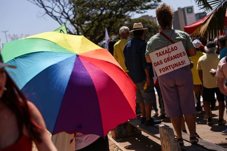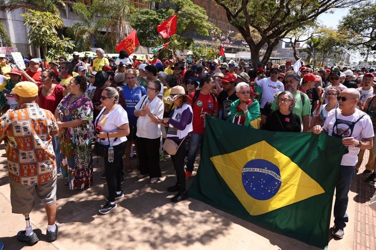Com cartazes em defesa da soberania nacional e das riquezas naturais do país, os manifestantes reivindicaram também a redução da jornada semanal de trabalho, a taxação dos super-ricos; e criticaram a tentativa de anistia dos acusados de tentativa de golpe.