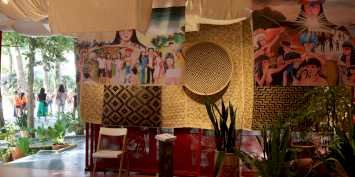 Assim, o público, ao entrar na Casa de Saberes, tem a sensação de poder sentar em bancos rústicos de madeira, a volta de uma fogueira, e folhear livros xamânicos, que tratam de filosofia e cosmologia.