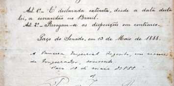 Sanção da Lei Áurea, diploma legal que extinguiu oficialmente a escravidão no Brasil (135 anos)
