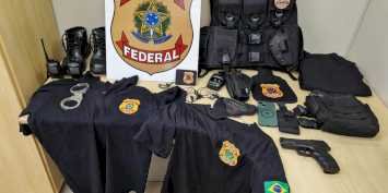 No cumprimento do mandado, os agentes federais apreenderam vários equipamentos. “Um celular, algemas, calça tática, coturno, colete tático com símbolo da PF e inscrição “POLÍCIA FEDERAL”, duas camisas com símbolos da PF, coldres, simulacro de arma de fogo, dois rádios comunicadores, além de outros acessórios”, informou a PF.