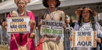 Em seguida, por volta das 12h30, os indígenas saíram em marcha pacífica pela Esplanada dos Ministérios até a Praça dos Três Poderes, onde acompanharão o julgamento do STF nesta tarde.