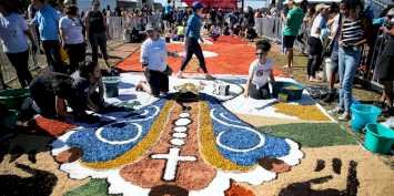 Os quadros do tapete de Corpus Christi são confeccionados no chão pelos fiéis, sobretudo, por grupos de jovens. Em 2023, cerca de 600 voluntários participaram da montagem.